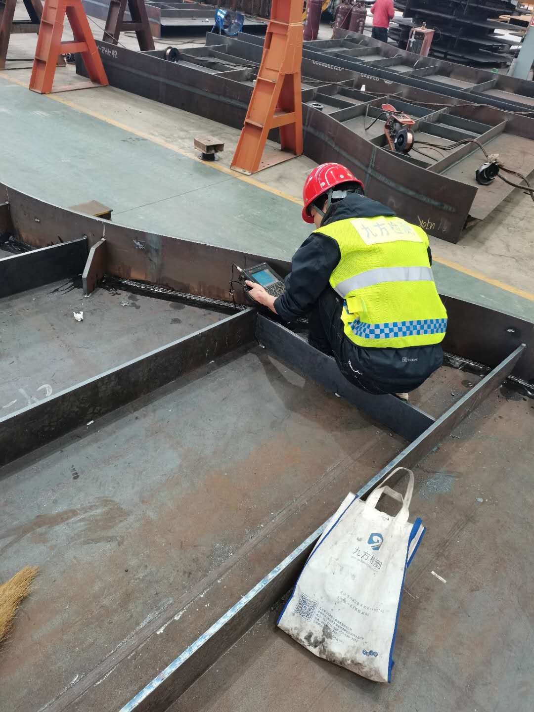 2020年6月29日,九方檢測(cè)工程師對(duì)廠內(nèi)制作焊縫開(kāi)始檢測(cè)。檢測(cè)內(nèi)容包括鋼結(jié)構(gòu)制作廠內(nèi)及現(xiàn)場(chǎng)安裝焊縫無(wú)損檢測(cè)、鋼板無(wú)損檢測(cè)、鋼材理化性能檢測(cè)、焊材理化性能檢測(cè)、涂裝質(zhì)量及其原材料檢測(cè)、緊固件檢測(cè)、焊接工藝評(píng)定。為了能更好地完成檢測(cè)任務(wù),九方檢測(cè)專(zhuān)門(mén)成立了創(chuàng)業(yè)大橋檢測(cè)項(xiàng)目部,人員及設(shè)備均優(yōu)先配備。