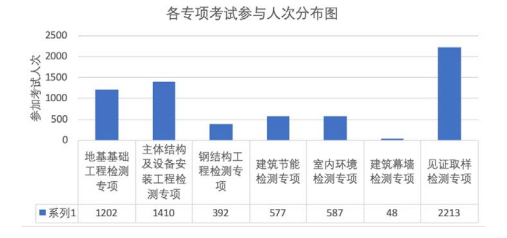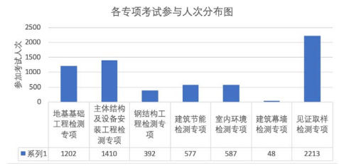 各專項考試人次分別為:地基基礎工程檢測專項1202人,主體結(jié)構(gòu)及設備安裝工程檢測專項1410人,鋼結(jié)構(gòu)工程檢測專項392人,建筑節(jié)能檢測專項577人,室內(nèi)環(huán)境檢測專項587人,建筑幕墻檢測專項48人,見證取樣檢測專項2213人,累計考試人次為:6429人次。詳見圖2。