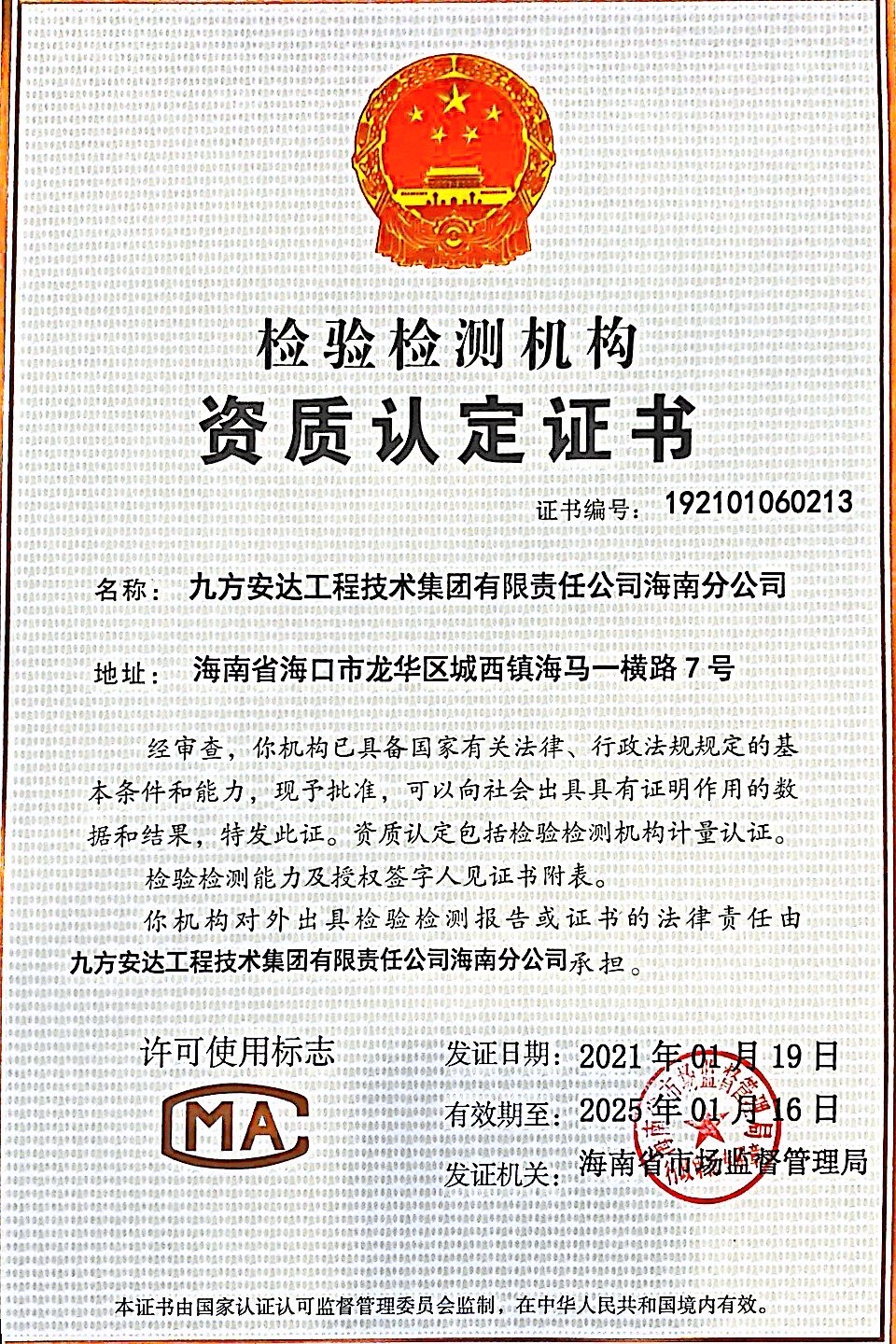 2021年1月19日,在九方安達集團大力支持下,經(jīng)過海南和湖北分公司全體同仁的共同努力,九方安達工程技術(shù)集團有限責任公司海南分公司通過了檢驗檢測機構(gòu)資質(zhì)認定增項評審。