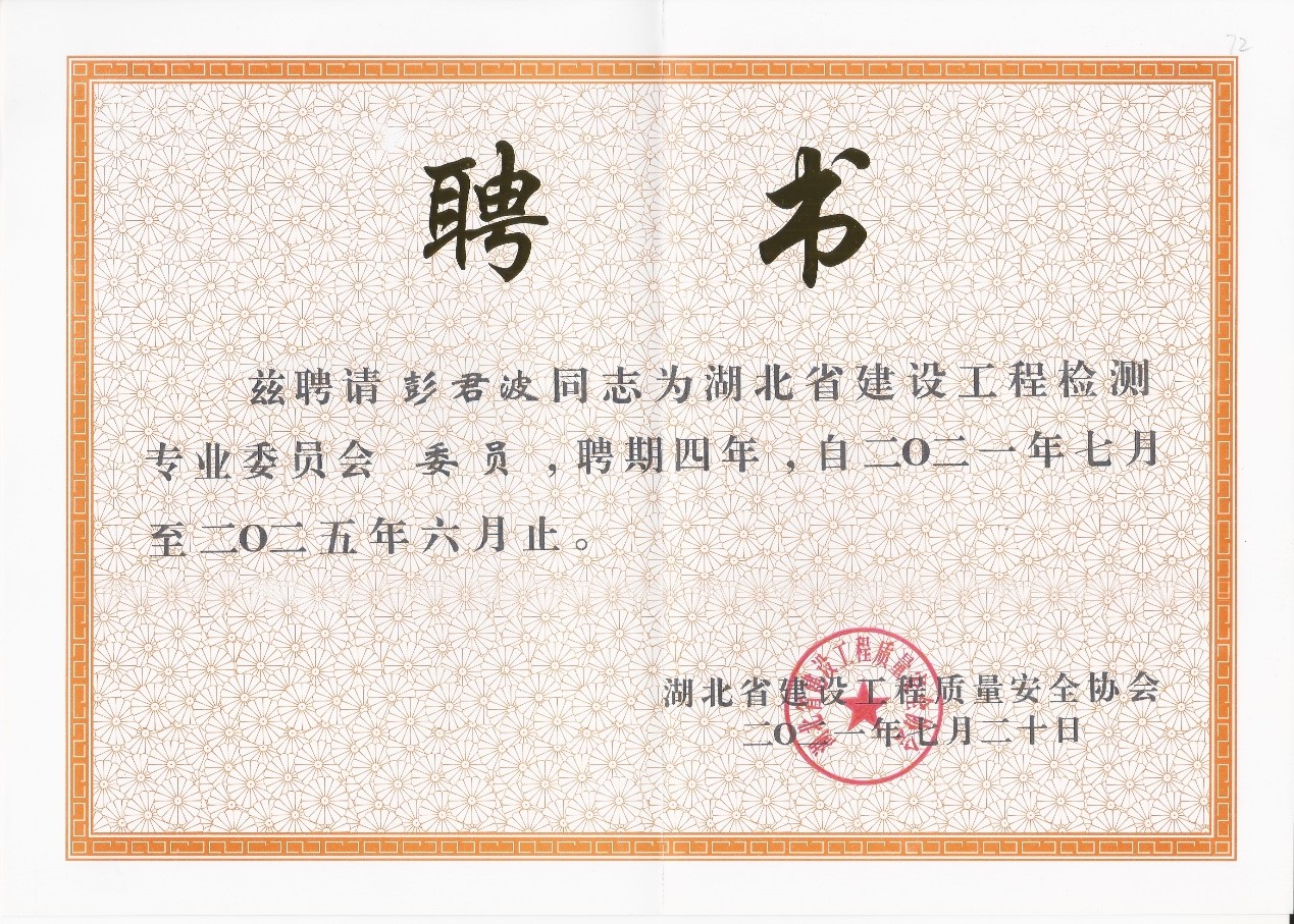 在質量管理、見證取樣、鋼結構和主體結構等專項類別中九方安達工程技術集團有限責任公司(下稱九方檢測)副總工程師彭君波和無損檢測事業(yè)部總經理萬立皓被聘為湖北省建設工程檢測專業(yè)委員會委員。