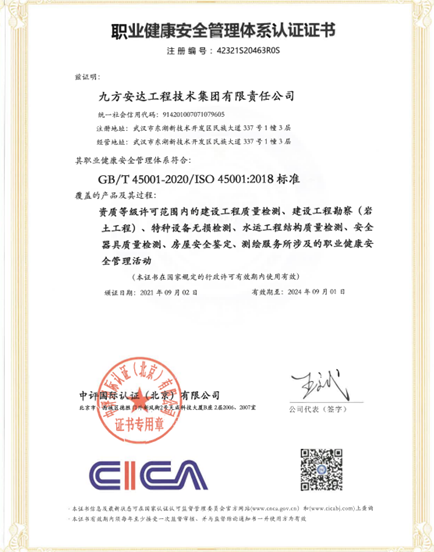 近日,九方安達(dá)工程技術(shù)集團(tuán)有限責(zé)任公司(下稱九方檢測(cè))順利通過ISO9001質(zhì)量管理、ISO14001環(huán)境管理以及ISO45001職業(yè)健康安全管理三大體系認(rèn)證,于2021年9月2日獲得中評(píng)國際認(rèn)證(北京)有限公司頒發(fā)的認(rèn)證證書。