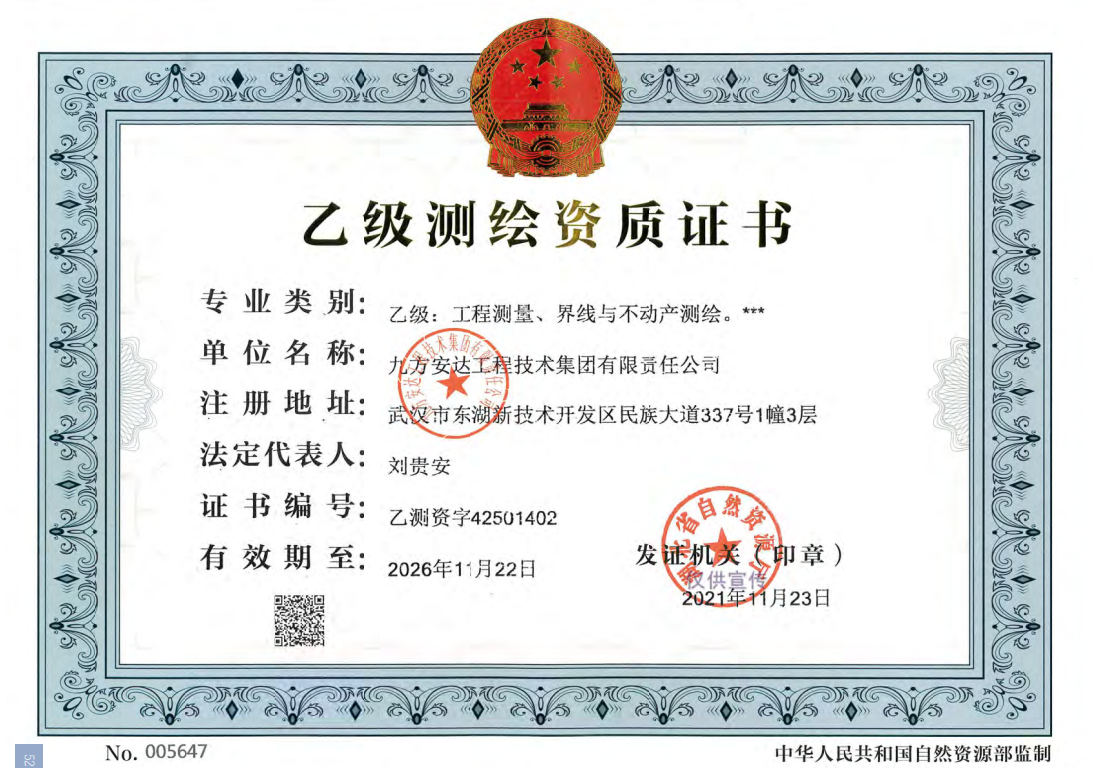 2021年11月23日,九方安達(dá)工程技術(shù)集團(tuán)有限責(zé)任公司已取得乙級(jí)測(cè)繪資質(zhì)證書(shū),即我司測(cè)繪資質(zhì)已順利升級(jí)至乙級(jí),并延續(xù)至2026年11月22日。