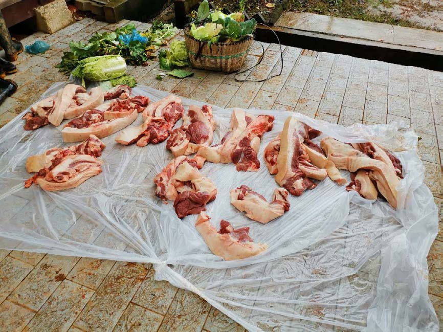 在大家的一陣忙碌之下,到了中午,一桌熱氣騰騰,品種豐富,食材新鮮的殺豬飯擺在了大家的面前,也不枉大家一上午的辛苦勞作。同時(shí),一刀刀豬肉也分好并整齊地?cái)[放在大家的面前。