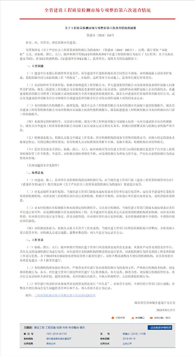 湖北省建設(shè)工程質(zhì)量檢測(cè)市場(chǎng)專項(xiàng)整治第六次巡查情況通報(bào)