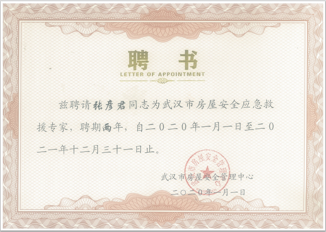 在建筑工程領(lǐng)域,九方安達(dá)工程技術(shù)集團(tuán)有限責(zé)任公司(簡(jiǎn)稱(chēng)九方檢測(cè))總工程師張彥君先生被聘請(qǐng)為武漢市房屋安全應(yīng)急救援專(zhuān)家。